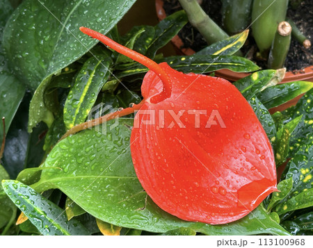 Anthurium scherzerianum with bright red spathe and curved spadix surrounded by glossy green leaves. Tropical ornamental plant close up in natural light