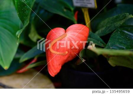 Red flower Anthurium (lat.- Anthurium Scherzerianum Lindsey) in the greenhouse