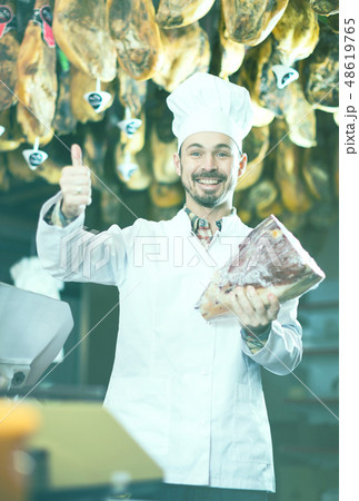 Closeup of cheerful female showing jamon in meat shop