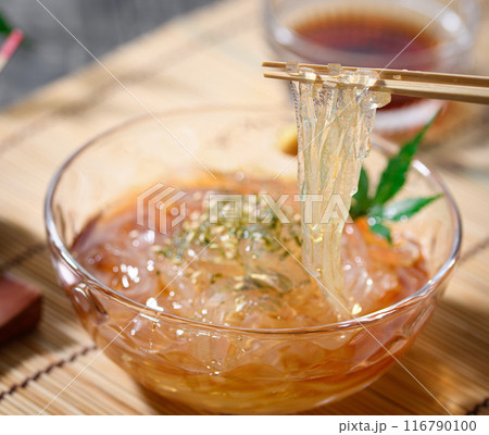涼粉_盛在玻璃碗中,放在竹蓆上