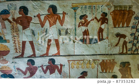 Luxor, Egypt: Corridor with ancient Egyptian inscriptions and hieroglyphs in a tomb.