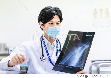 年輕的醫生看著X光片和診斷